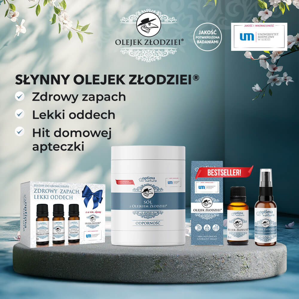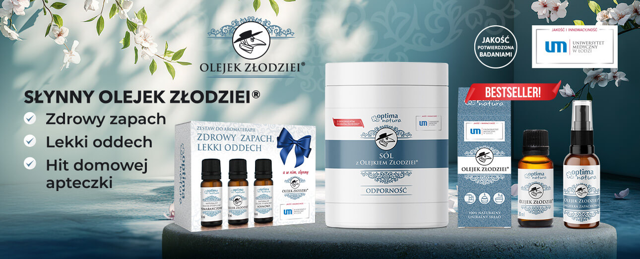 Olejek Złodziei® to unikatowa kompozycja olejków eterycznych, której receptura – według legendy – pochodzi ze średniowiecza. Kompozycja składa się z sześciu olejków: goździkowego, cytrynowego, cynamonowego z kory i liści, eukaliptusowego i rozmarynowego w odpowiednich ilościach. Badania Uniwersytetu Medycznego w Łodzi udowodniły, że Olejek Złodziei® wykazuje działanie przeciwbakteryjne, przeciwgrzybicze oraz przeciwwirusowe, szczególnie wobec czynników kolonizujących układ oddechowy powodujących infekcję tego obszaru. Warto po niego sięgnąć w sezonie przeziębień, bo korzystnie wpływa na układ odpornościowy. Olejek Złodziei® to produkt, który możesz stosować w dyfuzorach i kominkach zapachowych, a także wykorzystać do aromaterapeutycznej kąpieli lub masażu.