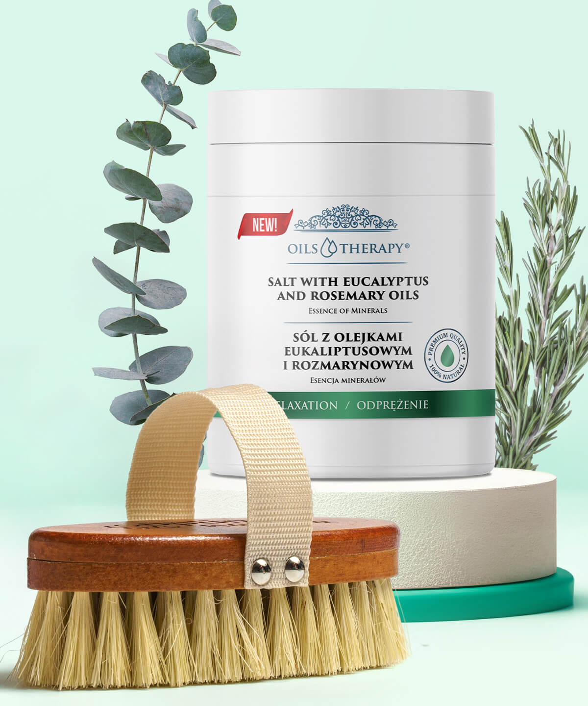 Zestaw Sól z olejkami eukaliptusowym i rozmarynowym + Szczotka (owalna)